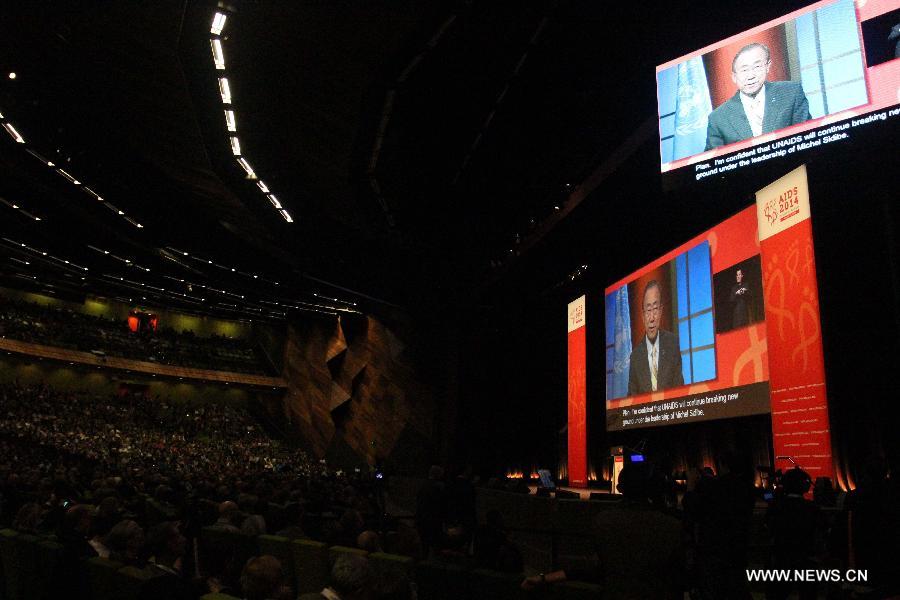 Secretary General of the United Nations Ban Ki-moon addresses the opening of the 20th International AIDS Conference at the Melbourne Convention and Exhibition Centre (MCEC) in Melbourne, Australia, on July 20, 2014. At least six delegates heading for Melbourne to join the 20th international AIDS conference were killed in the crash of Malaysian flight MH17. (Xinhua/Xu Yanyan) |