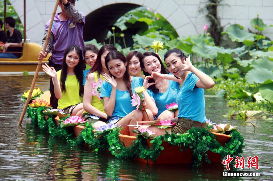 Ambassadors of Zhujiang city boat on a lake and put the floating Lotus lanterns on the water. 20 beautiful ambassadors of Zhujiang city attended the activities held in Lotus World in Foshan, south China's Guangdong province on July 20, 2014. (Photo/CNS) |