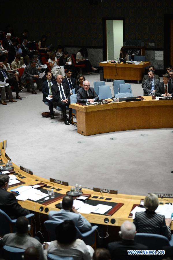 Dutch Foreign Minister Frans Timmermans (upper C) addresses a United Nations Security Council meeting regarding the Malaysian Airlines MH17 crash, at the UN headquarters in New York, on July 21, 2014. The UN Security Council on Monday approved a resolution demanding safe and unrestricted access to the MH17 crash site, and calling for full cooperation with the international investigation. (Xinhua/Niu Xiaolei) |
