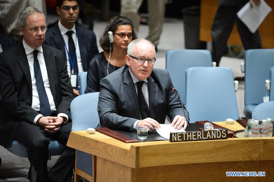 Dutch Foreign Minister Frans Timmermans (C) addresses a United Nations Security Council meeting regarding the Malaysian Airlines MH17 crash, at the UN headquarters in New York, on July 21, 2014. The UN Security Council on Monday approved a resolution demanding safe and unrestricted access to the MH17 crash site, and calling for full cooperation with the international investigation. (Xinhua/Niu Xiaolei) |