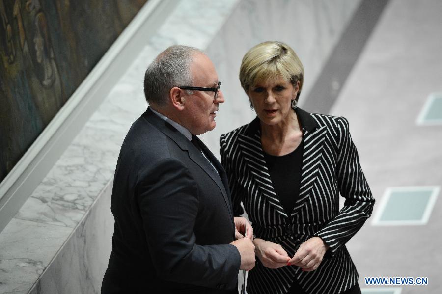Dutch Foreign Minister Frans Timmermans (L) speaks with his Australian counterpart Julie Bishop before a United Nations Security Council meeting regarding the Malaysian Airlines MH17 crash, at the UN headquarters in New York, on July 21, 2014. The UN Security Council on Monday approved a resolution demanding safe and unrestricted access to the MH17 crash site, and calling for full cooperation with the international investigation. (Xinhua/Niu Xiaolei) |