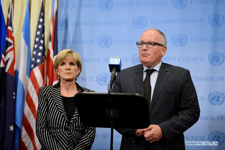 Dutch Foreign Minister Frans Timmermans (R) and his Australian counterpart Julie Bishop speak to media reporters after a United Nations Security Council meeting regarding the Malaysian Airlines MH17 crash, at the UN headquarters in New York, on July 21, 2014. The UN Security Council on Monday approved a resolution demanding safe and unrestricted access to the MH17 crash site, and calling for full cooperation with the international investigation. (Xinhua/Niu Xiaolei) |