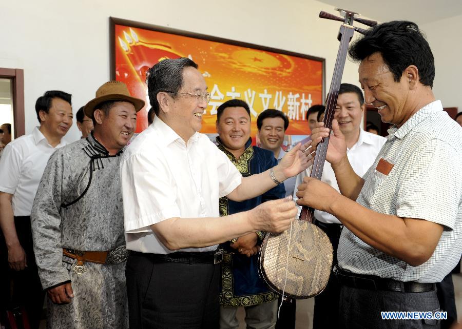 Yu Zhengsheng (L, front), chairman of the National Committee of the Chinese People's Political Consultative Conference (CPPCC), talks with a herdsman in a pastoral area in Erdos, north China's Inner Mongolia Autonomous Region, July 19, 2014. Yu made an inspection tour in Inner Mongolia from July 18 to 21. (Xinhua/Zhang Duo)