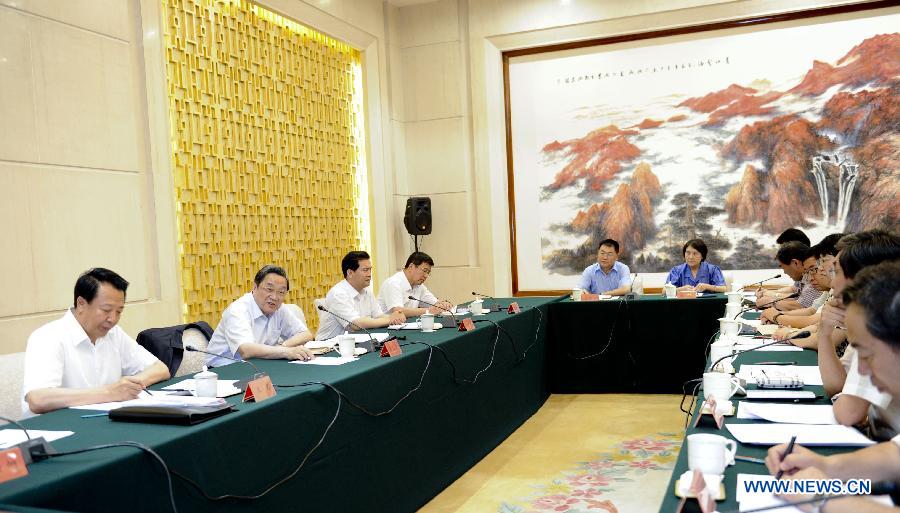 Yu Zhengsheng (2nd L), chairman of the National Committee of the Chinese People's Political Consultative Conference (CPPCC), holds a meeting with specialists and scholars in Hohhot, capital of north China's Inner Mongolia Autonomous Region, July 20, 2014. Yu made an inspection tour in Inner Mongolia from July 18 to 21. (Xinhua/Zhang Duo) |