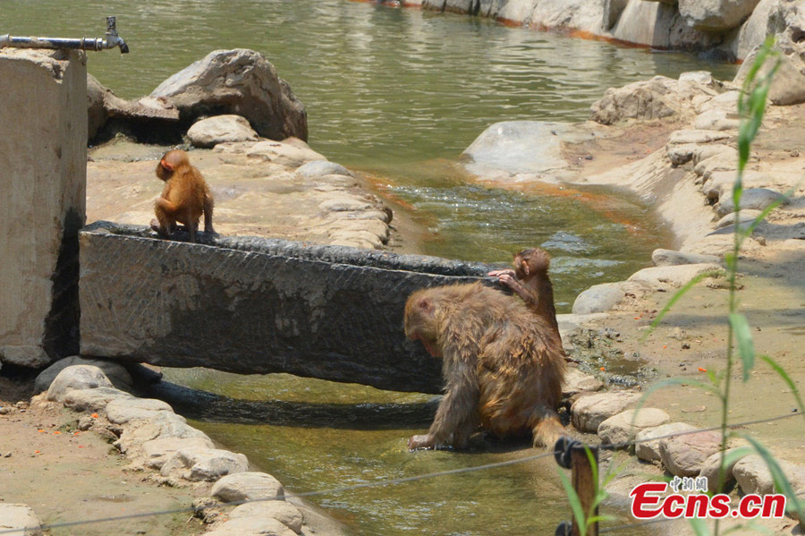 Animals are offered ice, shower, and watermelons to beat summer heat at Zhengzhou Zoo in Zhengzhou of Henan province on July 21, 2014. On Monday the city witnessed the highest temperature of nearly 40 degrees Celsius. [Photo/Liu Linzi]
