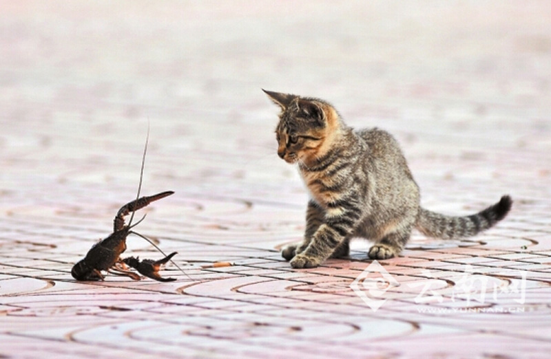 A fight between a lobster and three cats recently took place on the bank of Daguan River in Kunming, southwest China’s Yunnan province. A lobster that had wandered ashore came under attack of a cat, which, failing to win on its own, hailed its buddies to join the war. But after much power wrestling, the besieged lobster managed to escape the claws and jaws of the cats largely intact. (Photo/Yunnan.cn) |