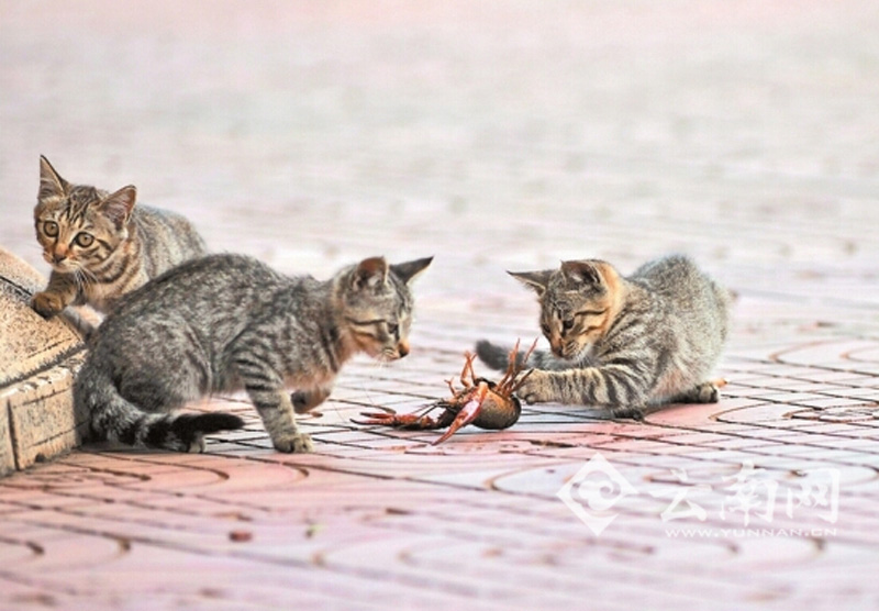 A fight between a lobster and three cats recently took place on the bank of Daguan River in Kunming, southwest China’s Yunnan province. A lobster that had wandered ashore came under attack of a cat, which, failing to win on its own, hailed its buddies to join the war. But after much power wrestling, the besieged lobster managed to escape the claws and jaws of the cats largely intact. (Photo/Yunnan.cn) |