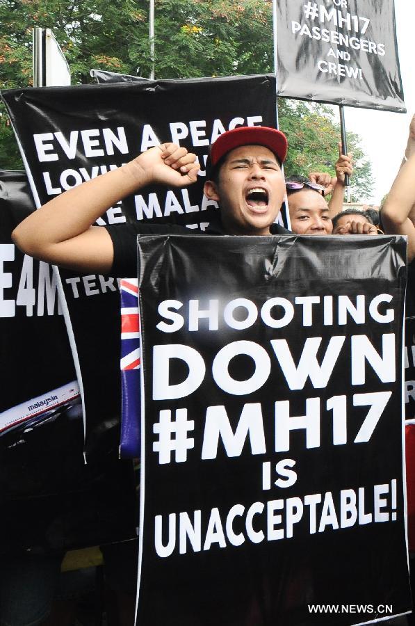 Protesters shout slogans demanding justice for the victims of Malaysia Airlines Flight MH17 at a rally held by Malaysia's ruling United Malays National Organization (UMNO)'s youth wing outside the Russian embassy and United Nations office in Kuala Lumpur July 22, 2014. Rallies are held by UMNO's youth wing outside Russian and Ukrainian embassies in Kuala Lumpur, demanding a justice investigation of the crash of Malaysian Airlines Flight MH17. (Xinhua/Chong Voon Chung) |