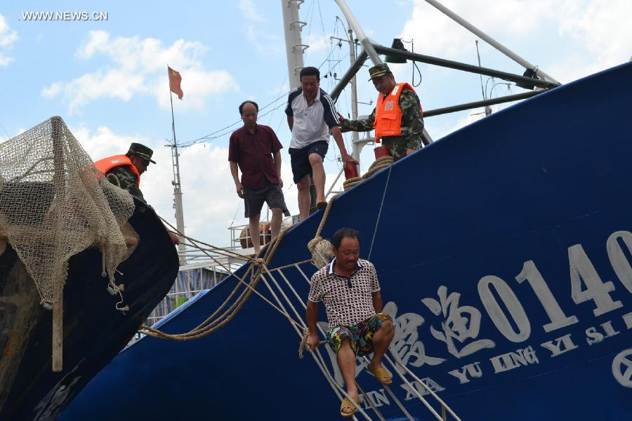 Border policemen transfer fishermen to a shelter at the Shacheng port in Diantou Town of Fuding City, southeast China's Fujian Province, July 22, 2014. Typhoon Matmo, the 10th typhoon to affect China this year, was approaching China's southeast coast on Tuesday. (Xinhua/Yuan Ziyou) |
