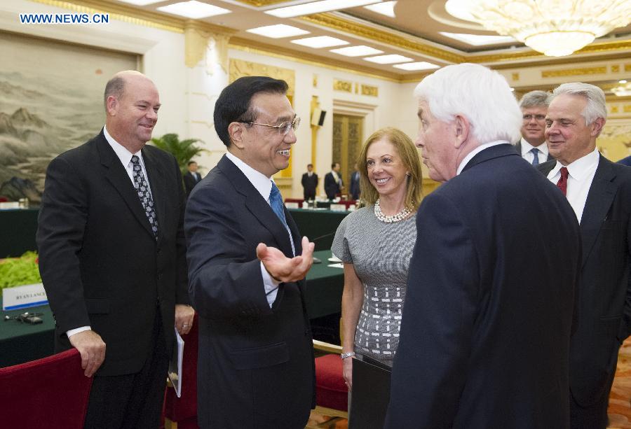 Chinese Premier Li Keqiang (2nd L) meets with a delegation of U.S. business leaders and former senior officials, who are here for the sixth round of dialogues between China-U.S. business leaders and former senior officials, in Beijing, capital of China, July 22, 2014. (Xinhua/Huang Jingwen)