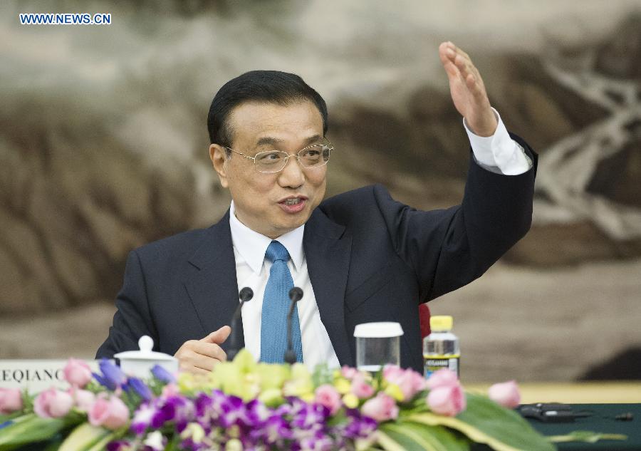 Chinese Premier Li Keqiang speaks in a meeting with a delegation of U.S. business leaders and former senior officials, who are here for the sixth round of dialogues between China-U.S. business leaders and former senior officials, in Beijing, capital of China, July 22, 2014. (Xinhua/Huang Jingwen) |