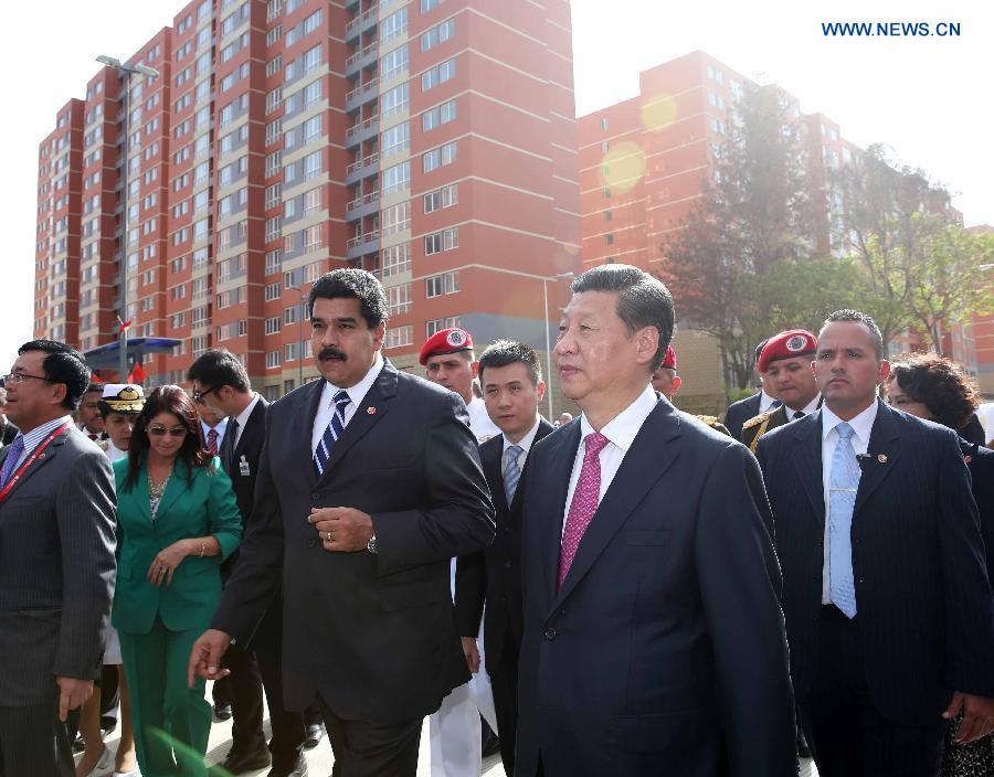 Chinese President Xi Jinping (R Front), accompanied by his Venezuelan counterpart Nicolas Maduro (2nd R Front), visits a housing project in Caracas, capital of Venezuela, July 21, 2014. (Xinhua/Lan Hongguang)