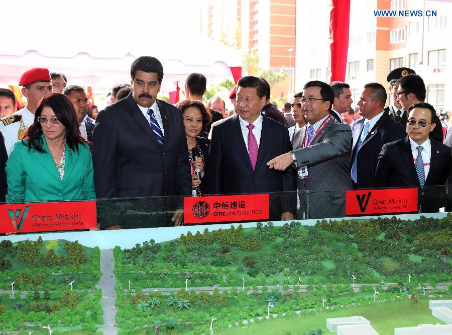 Chinese President Xi Jinping (C), accompanied by his Venezuelan counterpart Nicolas Maduro (2nd L), visits a housing project in Caracas, capital of Venezuela, July 21, 2014. (Xinhua/Lan Hongguang)