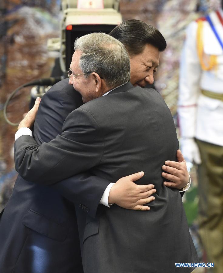 Chinese President Xi Jinping (L) hugs Cuban President Raul Castro after being awarded Cuba's Jose Marti Medal in Havana, capital of Cuba, July 22, 2014. (Xinhua/Ma Zhancheng)