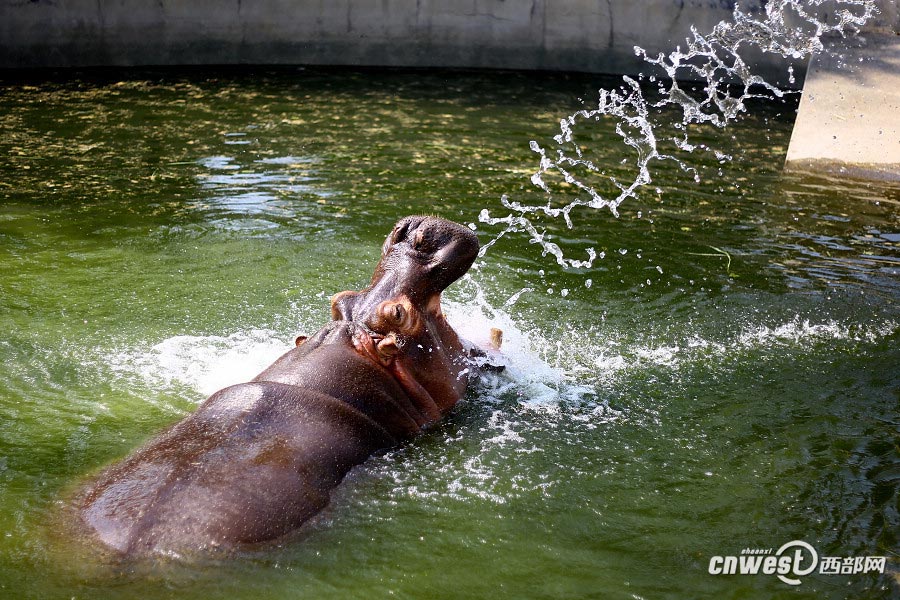 Heat waves have hit Xi'an recently. Breeders in a zoo provide green bean soup, ice cream and watermelon to animals. They've also offered air conditioners, swimming pools and cool showers to help animals remain cool in hot summer. (Photo: cnwest.com)