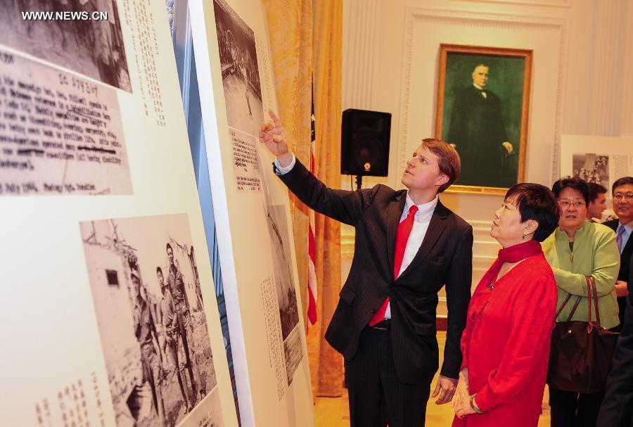 Christopher Nixon Cox (1st L), grandson of former U.S. President Richard Nixon, and Li Xiaolin (2nd L), president of the Chinese People's Association for Friendship with Foreign Countries, visit the photo exhibition "Salute to Friendship - Images Narrate China-U.S. Collaboration During World War II" at the Nixon Library in Yorba Linda City of California, the United States, July 23, 2014. The photos were taken by soldiers of the U.S. Army Signal Corps in China during WWII. (Xinhua/Zhang Chaoqun) |
