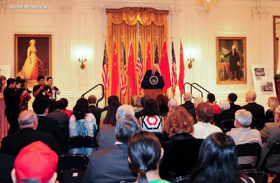 Former President of the Nixon Foundation Sandy Quinn speaks during the opening ceremony of the photo exhibition "Salute to Friendship - Images Narrate China-U.S. Collaboration During World War II" at the Nixon Library in Yorba Linda City of California, the United States, July 23, 2014. The photos were taken by soldiers of the U.S. Army Signal Corps in China during WWII. (Xinhua/Zhang Chaoqun) |