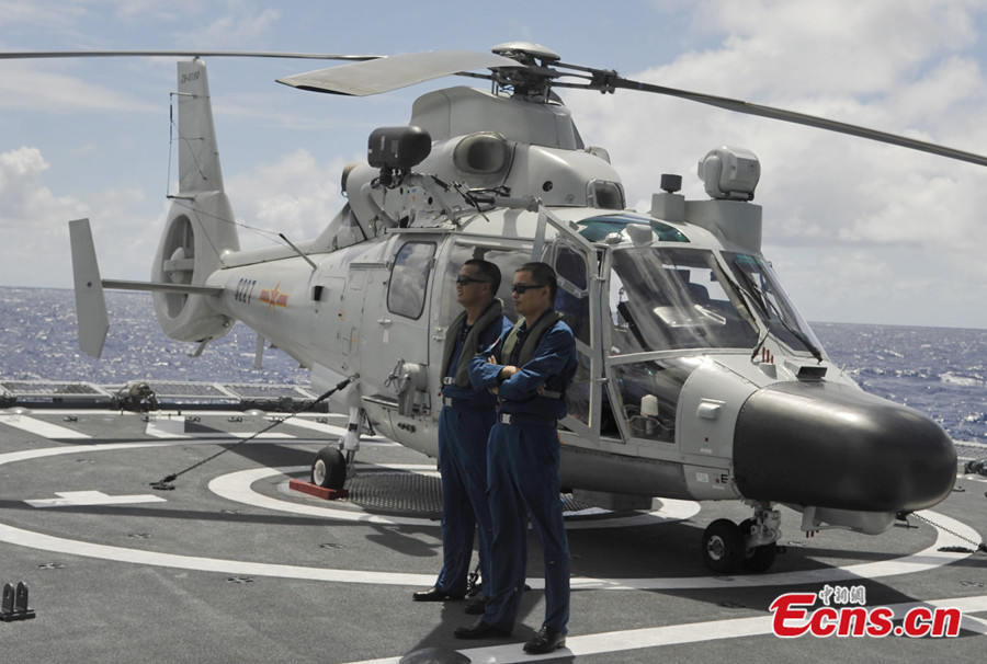 China's ship-borne helicopter is seen during the Rim of the Pacific (RIMPAC) multinational naval drill. China's navy exchanges copter landing experiences with other participating countries in the drill. [Photo: China News Service / Mao Jianjun]