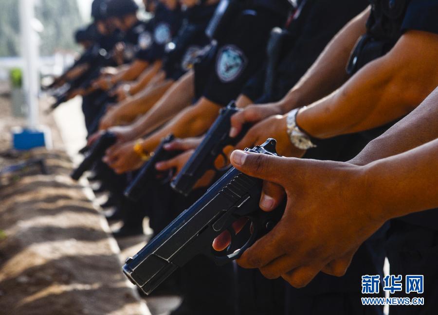 Special police officers check arms before patrolling on July 15, 2014. (Xinhua/ Zhaoge)