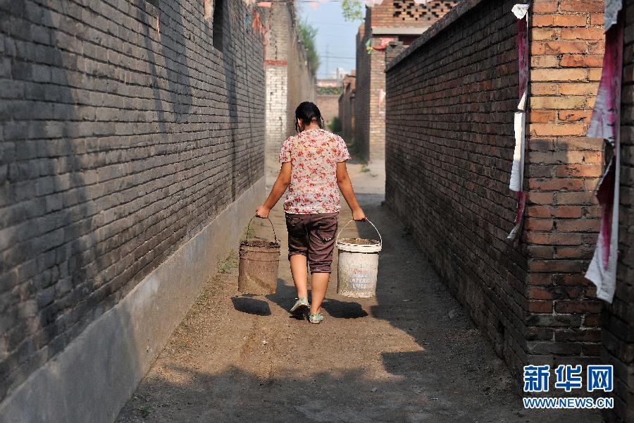 Niu Meili carries the heavy rubbish can and walks towards to the transfer station in the village. (Xinhua/Lu Yan)