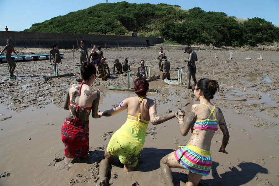 On July 22, 2014, thirty contestants to Miss Tourism China play in sea mud at the "Sea Mud Carnival" held in Xiushan, Zhoushan, Zhejiang province, attracting a largest number of tourists from Shanghai, Hangzhou, Suzhou and other cities. (Photo/youth.cn) |