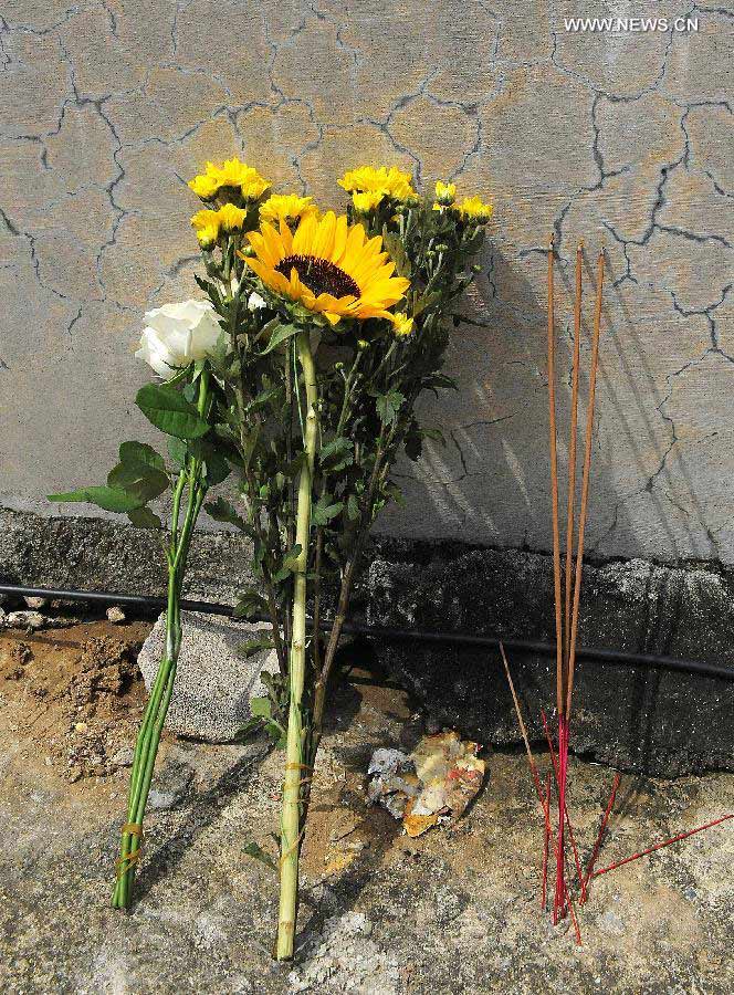 Photo taken on July 24, 2014 shows flowers at the accident site after a Taiwan plane smashed into residential buildings following a failed emergency landing in the outlying island county of Penghu, southeast China's Taiwan. Forty-eight people have been confirmed dead and 10 others injured in the plane crash, which occurred on Wednesday evening. The plane, TransAsia Airways Flight GE 222, with 58 people on board, was then on its way from Taiwan's Kaohsiung to Penghu. Family members of victims of the accident held memorial service at the site for their beloved ones on Thursday. (Xinhua/He Junchang) |