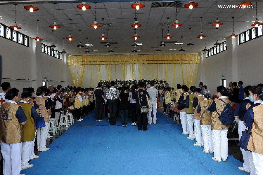 Family members of victims in a plane crash accident hold memorial service for their beloved ones at the local funeral parlour after a Taiwan plane smashed into residential buildings following a failed emergency landing in the outlying island county of Penghu, southeast China's Taiwan, July 24, 2014. Forty-eight people have been confirmed dead and 10 others injured in the plane crash, which occurred on Wednesday evening. The plane, TransAsia Airways Flight GE 222, with 58 people on board, was then on its way from Taiwan's Kaohsiung to Penghu. (Xinhua/He Junchang)