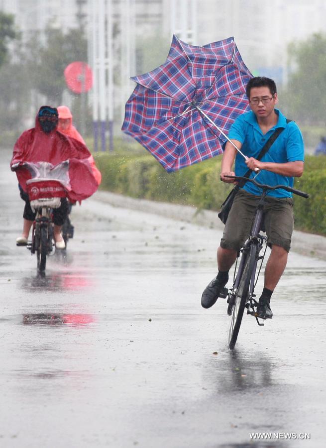 Citizens ride against strong wind in Yangzhou, east China's Jiangsu Province, July 25, 2014. Typhoon Matmo, the 10th typhoon that affects China this year, brought along heavy rainfalls to many places in Jiangsu. (Xinhua/Cui Genyuan)