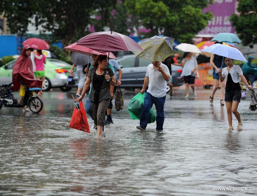 Pedestrians wade along a waterlogged road in Huai'an, east China's Jiangsu Province, July 25, 2014. Typhoon Matmo, the 10th typhoon that affects China this year, brought along heavy rainfalls to many places in Jiangsu. (Xinhua/He Jinghua)