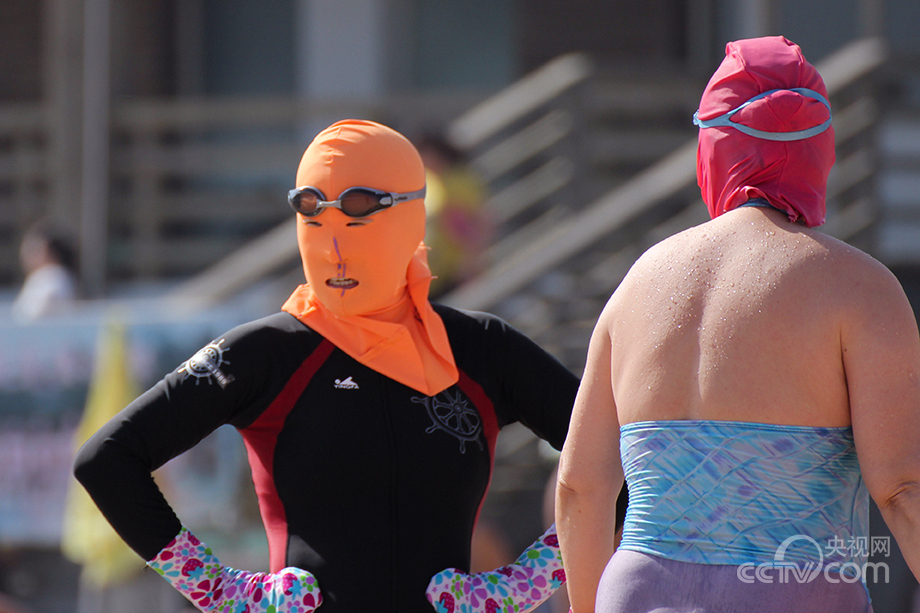 Women wearing facekini spend holidays on the beach of Qingdao in east China's Shandong province on May 26, 2014. Facekini is a skin mask designed for swimmers and beachgoers which covers the head and reveals only the eyes, nose, and mouth. This mask is popular in the Chinese city of Qingdao, where it is used by people for protecting themselves from UV rays while tanning and from jellyfish while at the beach.(Photo/CNTV) |