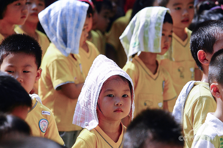 Children put handkerchiefs on heads to resist the hot sunshine in a kindergarten in Guangzhou on May 29, 2014. (Photo/CNTV)