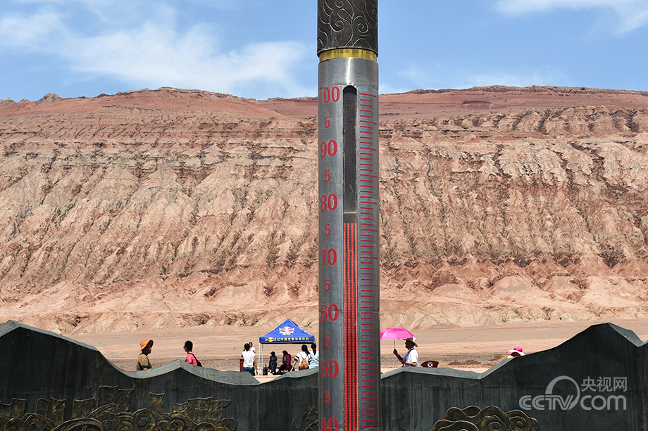 A giant thermometer shows the temperature in Turpan area, Xinjiang reaching 76 degrees Celsius on July 13, 2014. (Photo/CNTV)