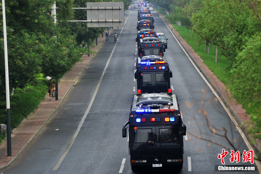 On July 24, Beijing Public Security Bureau holds anti-terrorism exercise to further test and improve the anti-terrorism capabilities. Police helicopters were used in the drill to transmit images. (CNS Photo)