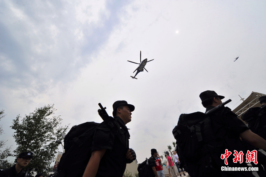 On July 24, Beijing Public Security Bureau holds anti-terrorism exercise to further test and improve the anti-terrorism capabilities. Police helicopters were used in the drill to transmit images. (CNS Photo)