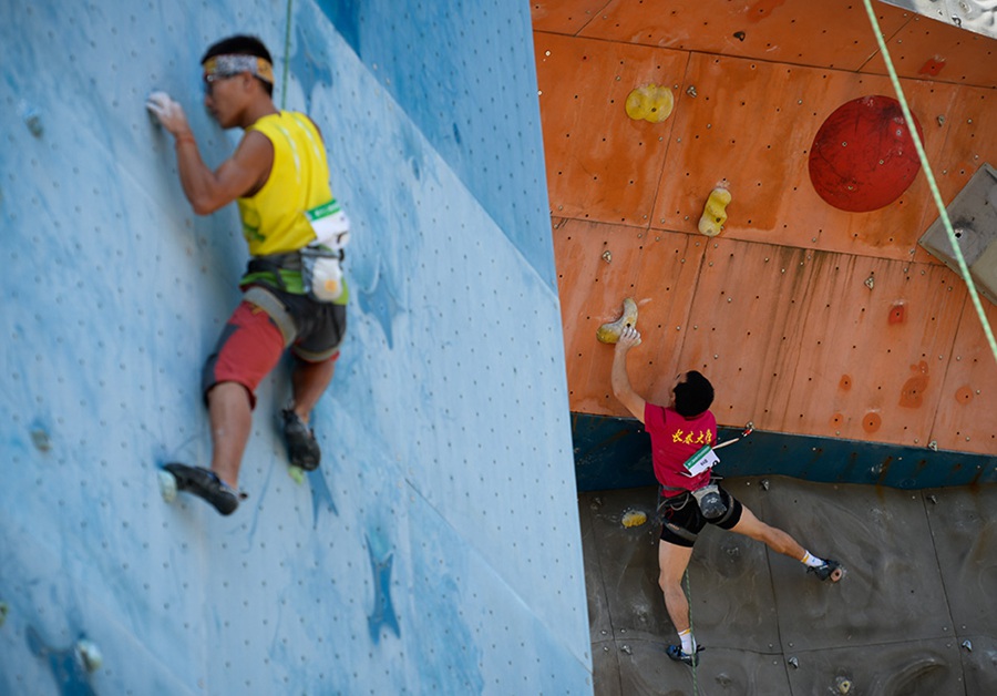 The Twelfth National College Climbing Championships start in Sichuan Institute of Tourism in Chengdu, July 24, 2014. The four-day tournament tests athletes in speed, difficulty of climbing and bouldering project. 245 athletes from 40 colleges and universities including Peking University, Donghua University, University of Macau, and 93 team leaders and coaches participated in the contest.(Xinhua/Li Qiaoqiao) |