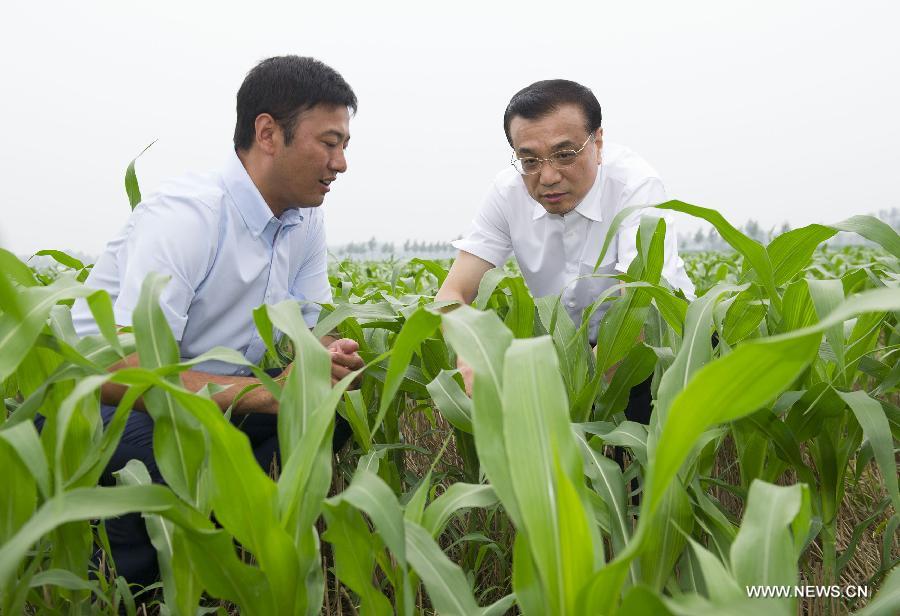 Chinese Premier Li Keqiang (R) visits Deqiang Farm in Lingxian County of Dezhou, east China's Shandong Province, July 24, 2014. Li had an inspection tour in Shandong from July 24 to 25. (Xinhua/Huang Jingwen)