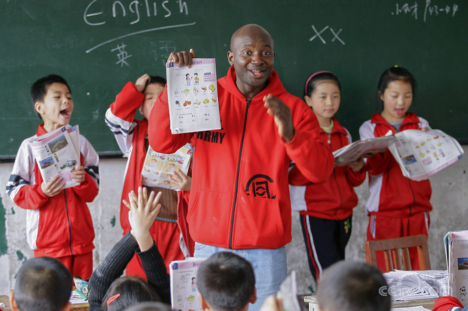 A Nigerian student from Central China Normal University gives lessons to the children of migrant workers in Chunmiao Primary school in Wuhan, central China's Hubei province on April 16, 2012. He has been a volunteer teacher in the primary school for two years. (Photo/CNTV) |