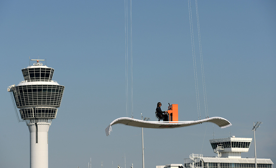 German pianist Stefan Aaron hovers about the Munich airport Franz-Josef-Strauss, southern Germany on July 23, 2014. Stefan Aaron was seated in front of his piano on an aluminum structure that was reminiscent of a flying carpet and attached to a helicopter as part of his "Orange Piano Tour". (Source: Xinhua News Agency) |