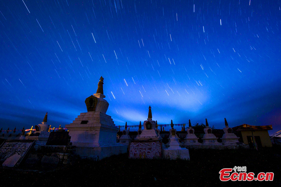Photo shows night scenery of pagoda forests under starry sky at Waqie township of Hongyuan county in Aba Tibetan and Qiang autonomous prefecture, southwest China's Sichuan province. [Photo/Deng Chonggang]