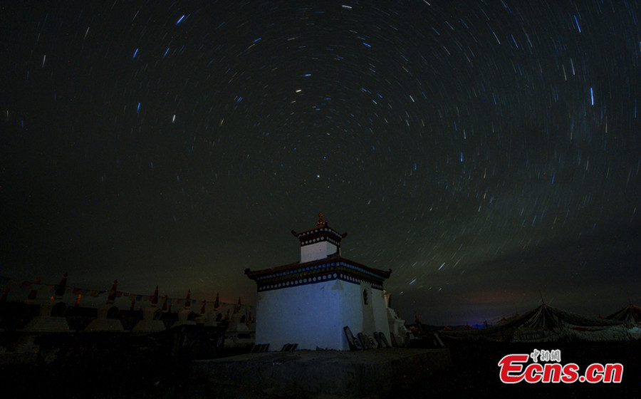 Photo shows night scenery of pagoda forests under starry sky at Waqie township of Hongyuan county in Aba Tibetan and Qiang autonomous prefecture, southwest China's Sichuan province. [Photo/Deng Chonggang]