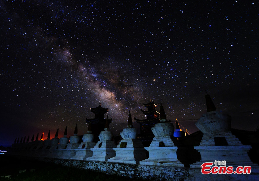 Photo shows night scenery of pagoda forests under starry sky at Waqie township of Hongyuan county in Aba Tibetan and Qiang autonomous prefecture, southwest China's Sichuan province. [Photo/Deng Chonggang]