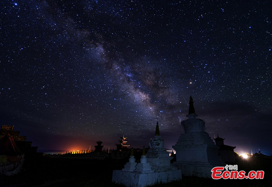 | Photo shows night scenery of pagoda forests under starry sky at Waqie township of Hongyuan county in Aba Tibetan and Qiang autonomous prefecture, southwest China's Sichuan province. [Photo/Deng Chonggang] |