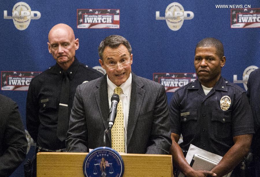Senior officers of Los Angeles Police Department (LAPD) Andrew Smith (L) and William Scott (R) look on as University of Southern California's (USC) senior administration vice president Todd Dickey (C) speaks at a press conference as LAPD announces the arrest of five individuals (two adults and three minors) suspected in connection with the July 24 death of a Chinese graduate student at USC, in Los angeles, California on July 28, 2014. (Xinhua/Zhao Hanrong) |