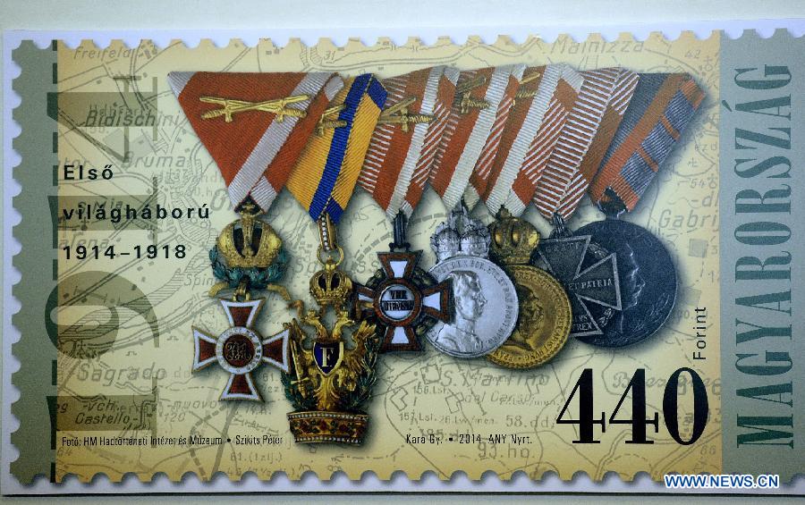 A commemorative stamp is launched to mark the 100th anniversary of the First World War (WWI) in Budapest, Hungary, July 28, 2014. Hungary on Monday commemorated the beginning of the WWI that took more than ten million lives and left the world in tatters. (Xinhua/MTI/Kovacs Tamas) |