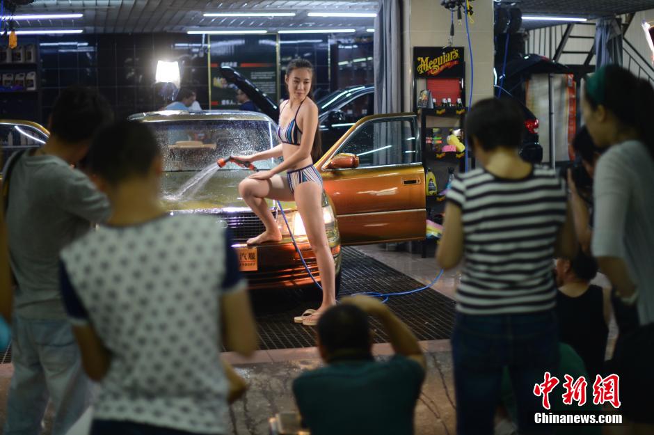 A model in bikini washes the cars in a commercial activity in Taiyuan, north China's Shanxi province on July 27, 2014, which has attracted public's attention. (CNS/Wei Liang)