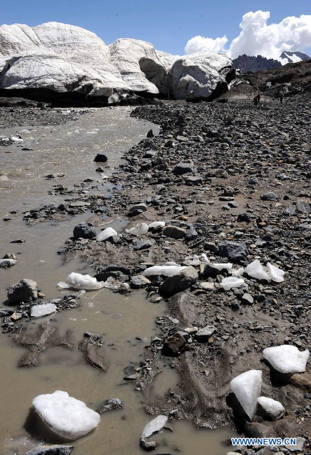 Photo taken on July 15, 2014 shows the melting ice of Purog Kangri Glacier in Shuanghu County, Nagqu, southwest China's Tibet Autonomous Region. As the highest terrain in the world's mid-latitude regions, China's Qinghai-Tibet Plateau is now under negative influence of the global warming. Purog Kangri Glacier, the third largest in the world, has shrunk by 50 meters over the past 30 years. (Xinhua/Tang Zhaoming)