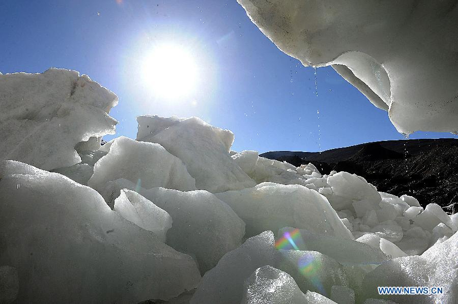 Photo taken on July 15, 2014 shows the melting ice of Purog Kangri Glacier in Shuanghu County, Nagqu, southwest China's Tibet Autonomous Region. As the highest terrain in the world's mid-latitude regions, China's Qinghai-Tibet Plateau is now under negative influence of the global warming. Purog Kangri Glacier, the third largest in the world, has shrunk by 50 meters over the past 30 years. (Xinhua/Tang Zhaoming) |