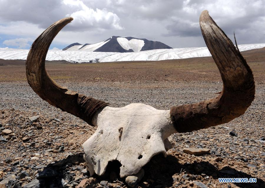 Photo taken on July 15, 2014 shows a Yak skull with Purog Kangri Glacier in its background in Shuanghu County, Nagqu, southwest China's Tibet Autonomous Region. As the highest terrain in the world's mid-latitude regions, China's Qinghai-Tibet Plateau is now under negative influence of the global warming. Purog Kangri Glacier, the third largest in the world, has shrunk by 50 meters over the past 30 years. (Xinhua/Tang Zhaoming) |