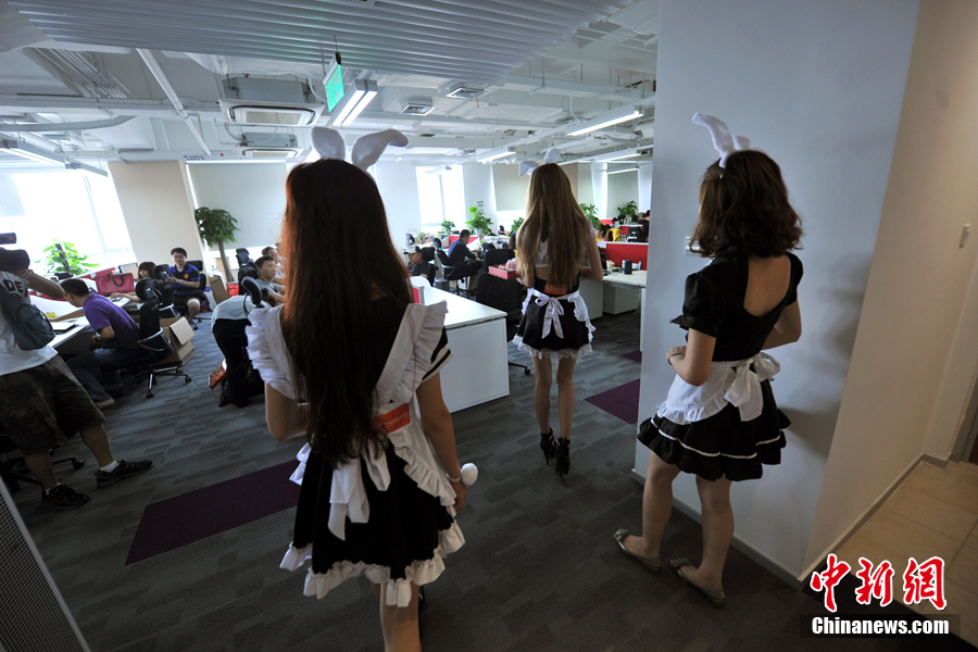 Girls hand out candies in the office. (CNS/Jin Shuo)