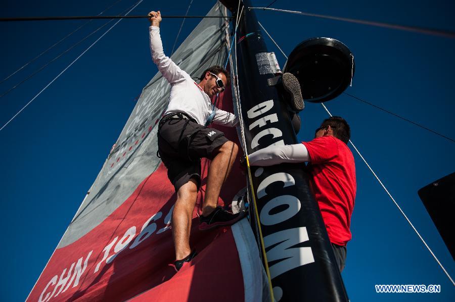 Eric Peron (L), trimmer of Dongfeng Team climbs on the mast to help his teammates to hoist the mainsail during the offshore training in the Bay of Biscay, western France, on July 3, 2014. The China's Dongfeng Team prepares for Volvo Ocean Race 2014-2015 starting from Alicante of Spain in October, and it will last for nearly 9 months with 10 legs of competition over almost 39000 nautical miles (72000 km) around the world until it ends in Gothenburg of Sweden in June 2015. (Xinhua/Bu Duomen) |
